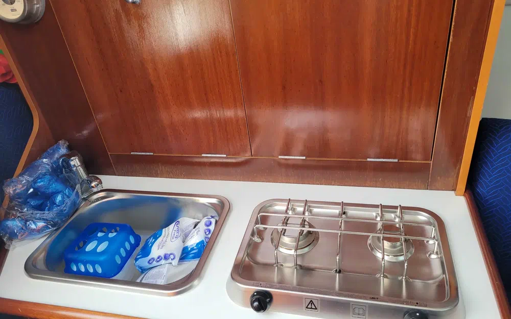 Une cuisine avec 2 réchauds gaz, évier, poubelle et réfrigérateur