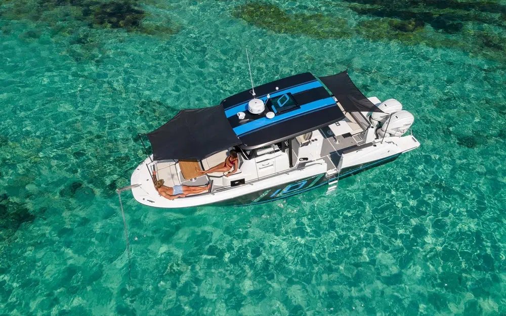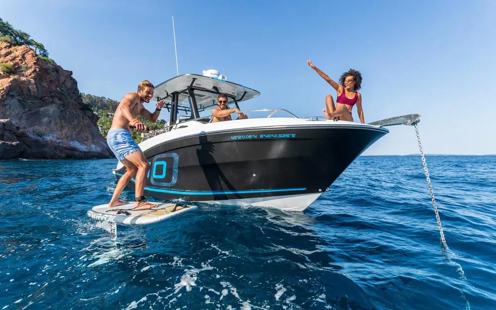 Que vous aimiez plutôt vous abriter à l’ombre sous le t-top en standard ou que vous optiez pour les grands bains de soleil pour vous prélasser après la baignade, les espaces extérieurs de plain-pied ont été pensés pour le partage de moments conviviaux. Pour les adeptes de la pêche, à vous les équipements dédiés comme les porte-cannes sur le toit ou le vivier transparent !