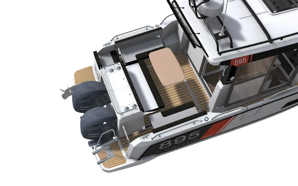 Le Merry Fisher 895 Sport s’adresse à ceux qui veulent vivre la mer en mode sportif : excursions, pêche, plongée, kayak, kitefurf… Priorité est donnée aux espaces extérieurs, vastes, modulables, dotés de grands rangements, de barres de toit, de mains courantes sécurisantes et de passavants encastrés et profonds qui facilitent la circulation à bord. Le cockpit totalement dégagé se prête merveilleusement aux actions de pêche. À l’avant, un cockpit en L fait office de salon d’extérieur, convertible en bain de soleil, pour ceux qui préfèrent contempler la mer ou siroter un jus de fruit après l’effort.