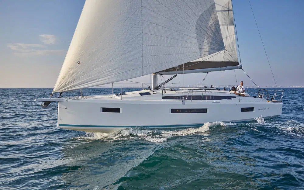 À voir le confort, l’esthétisme et la sensation d’espace affichés par le Sun Odyssey 410, on en oublierait presque qu’il s’agit d’un voilier, performant dont les innovations ont été, avant tout, pensées pour améliorer l’efficacité et la sécurité de la navigation. Les passavants inclinés, les hiloires relevés, la bôme abaissée, l’étrave inversée ont été conçus dans cet esprit, et contribuent, à l’élégance et au style de ce voilier.